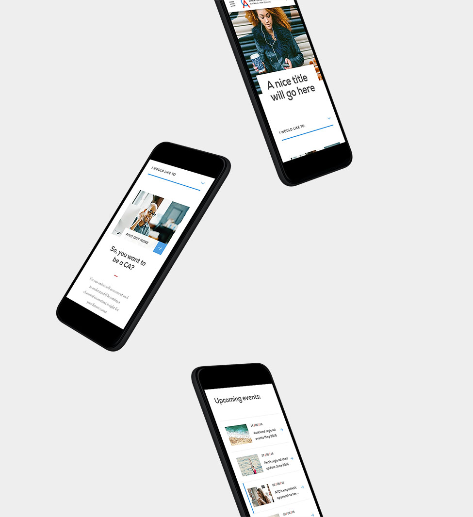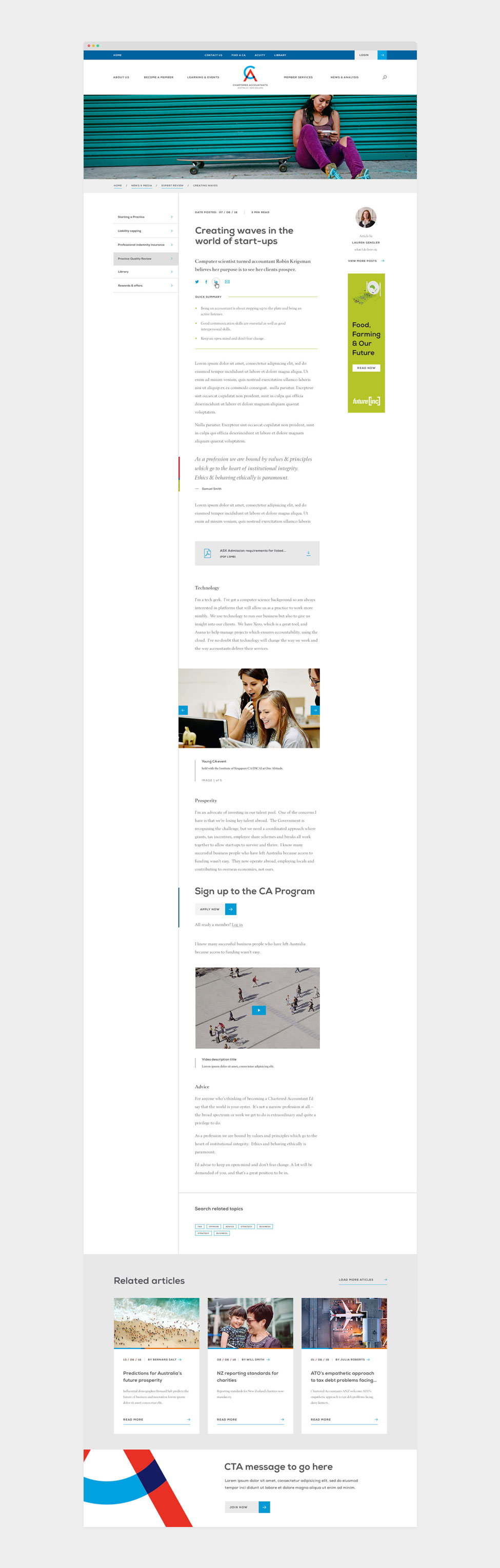 CA ANZ's story is introduced by an authentic and natural video reel that plays at the top of the home page. The story continues with centred content anchored by a visual line which creates a point of focus for the user as they move down the page.