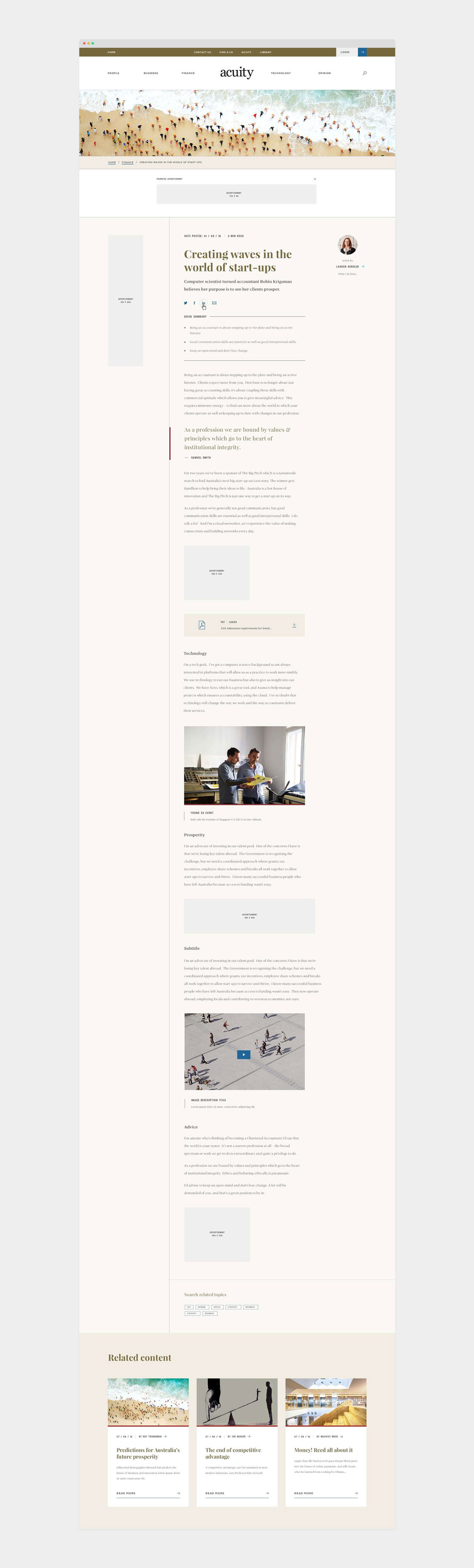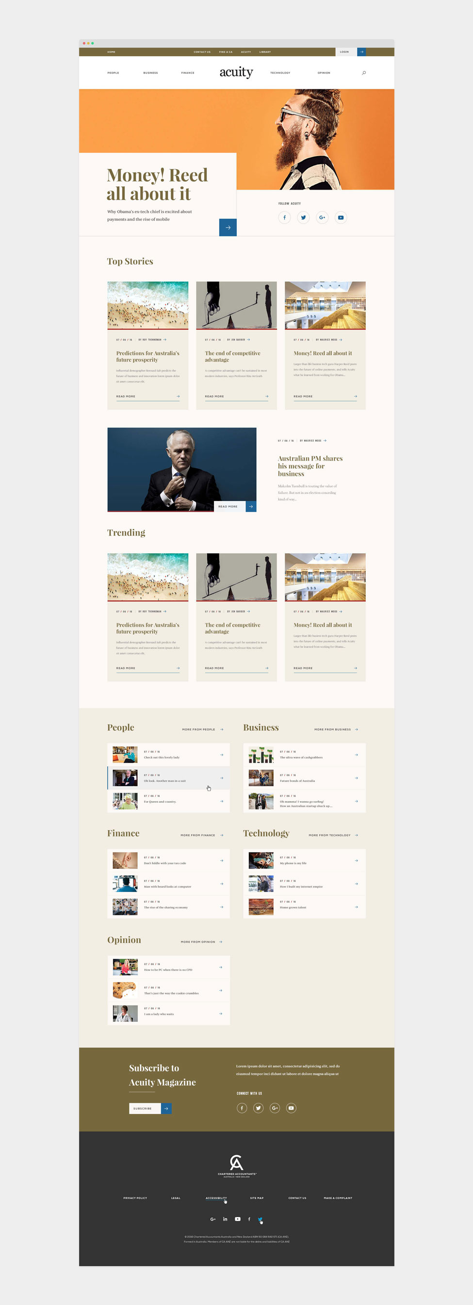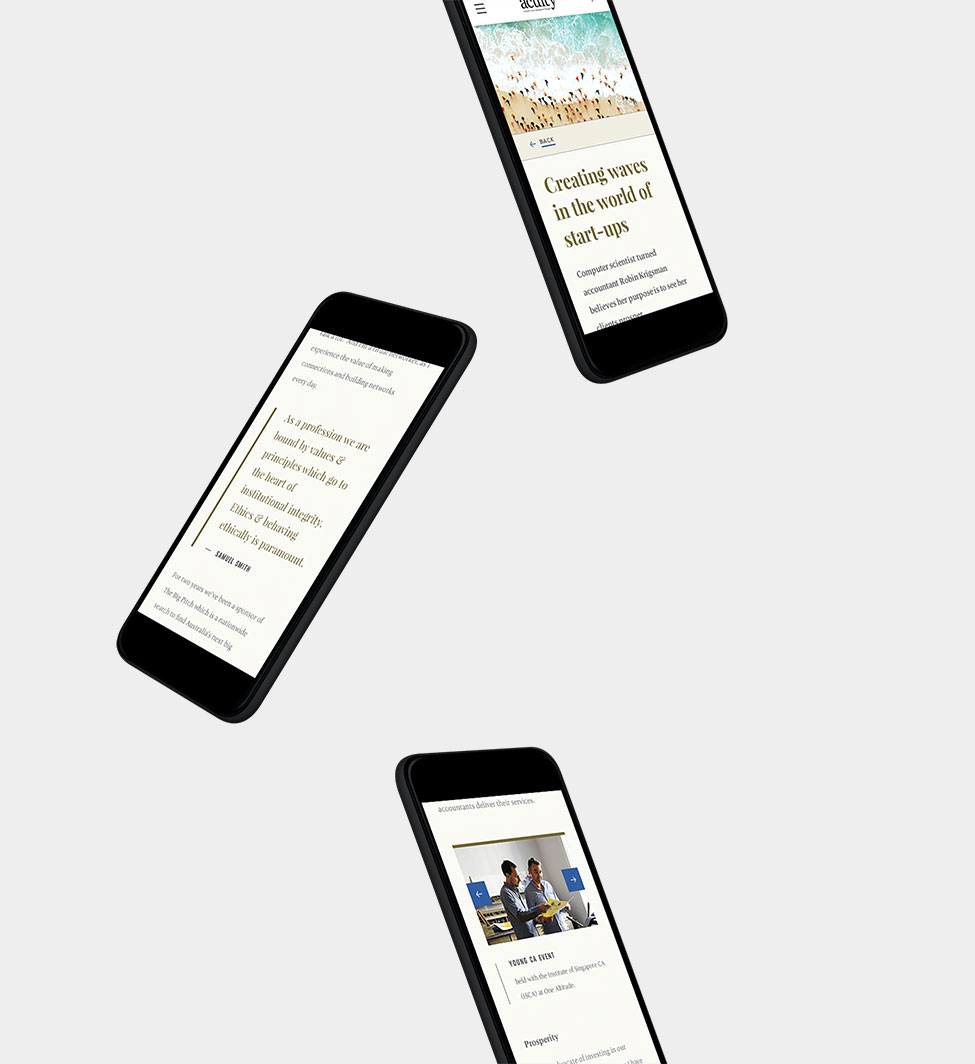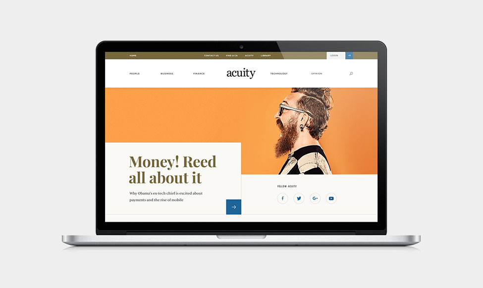 Chartered Accountants ANZ also asked Deloitte Digital to create a microsite for their print magazine, Acuity. We applied the Acuity branding and gave the home page its own distinct look and feel. Acuity was designed with a classic and luxe editorial aesthetic, while still maintaining the general layout of the CA ANZ website.