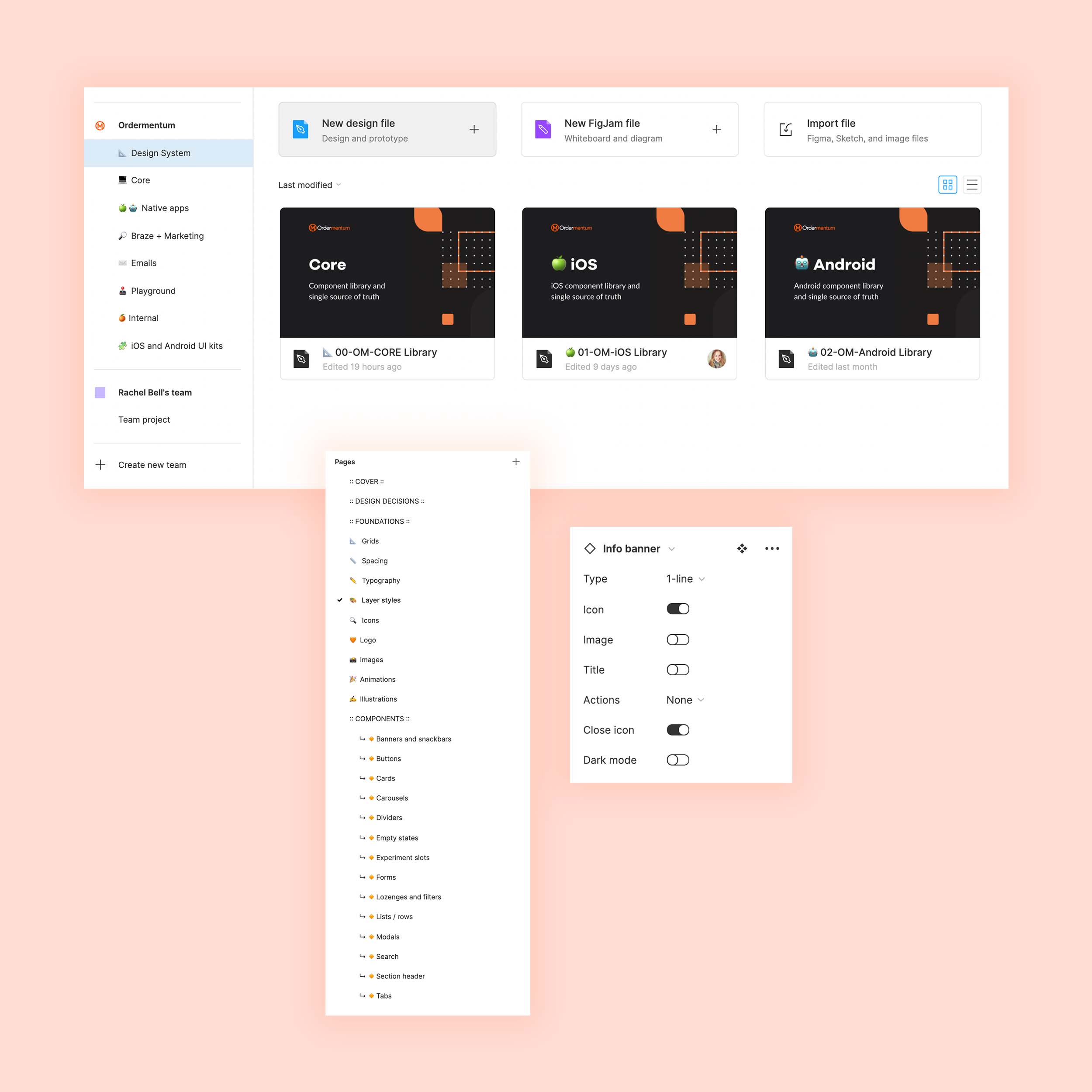 I reorganised the projects in Figma, set up separate design systems which worked together, and used variants to make it easy to swap out components.