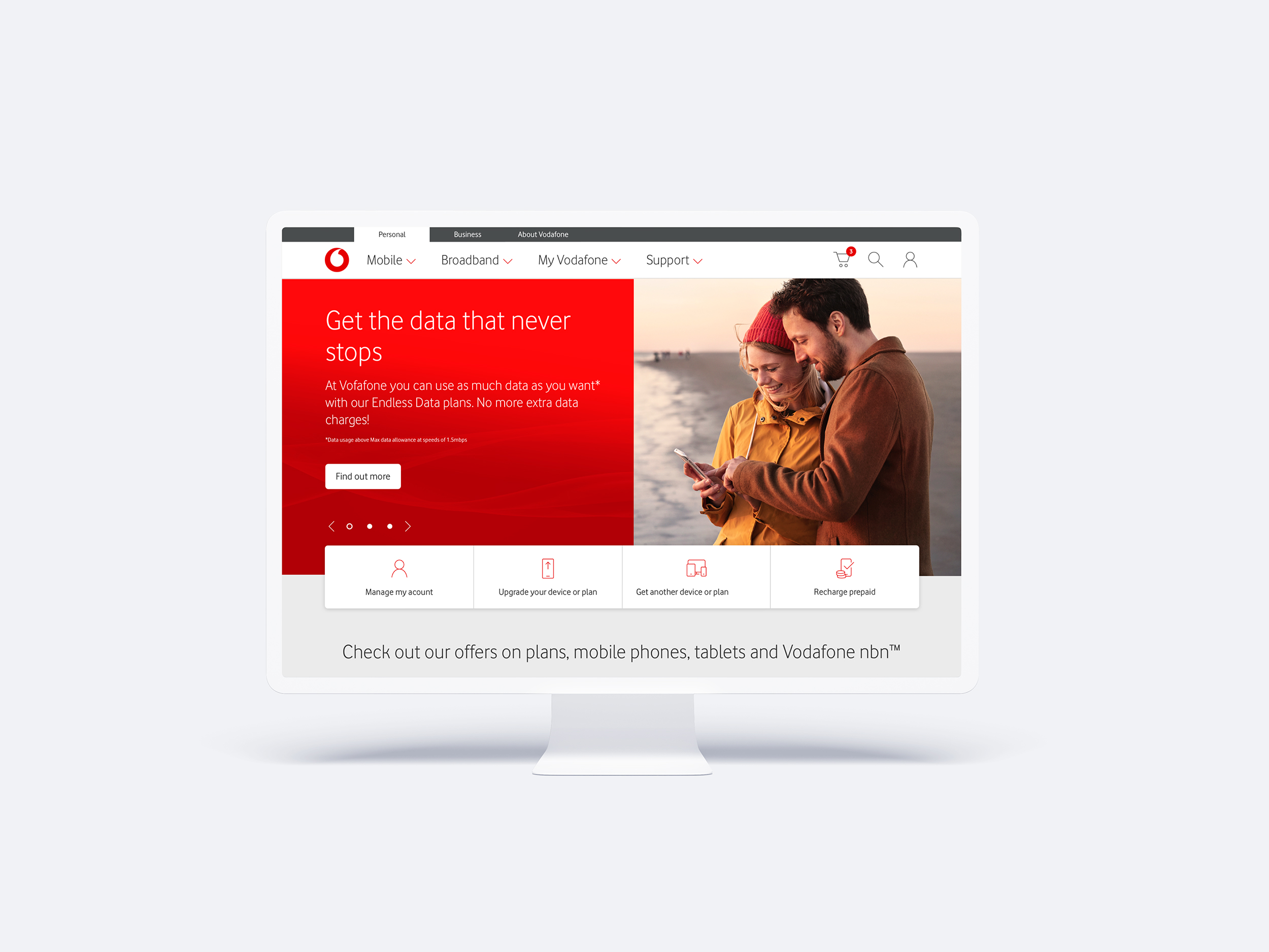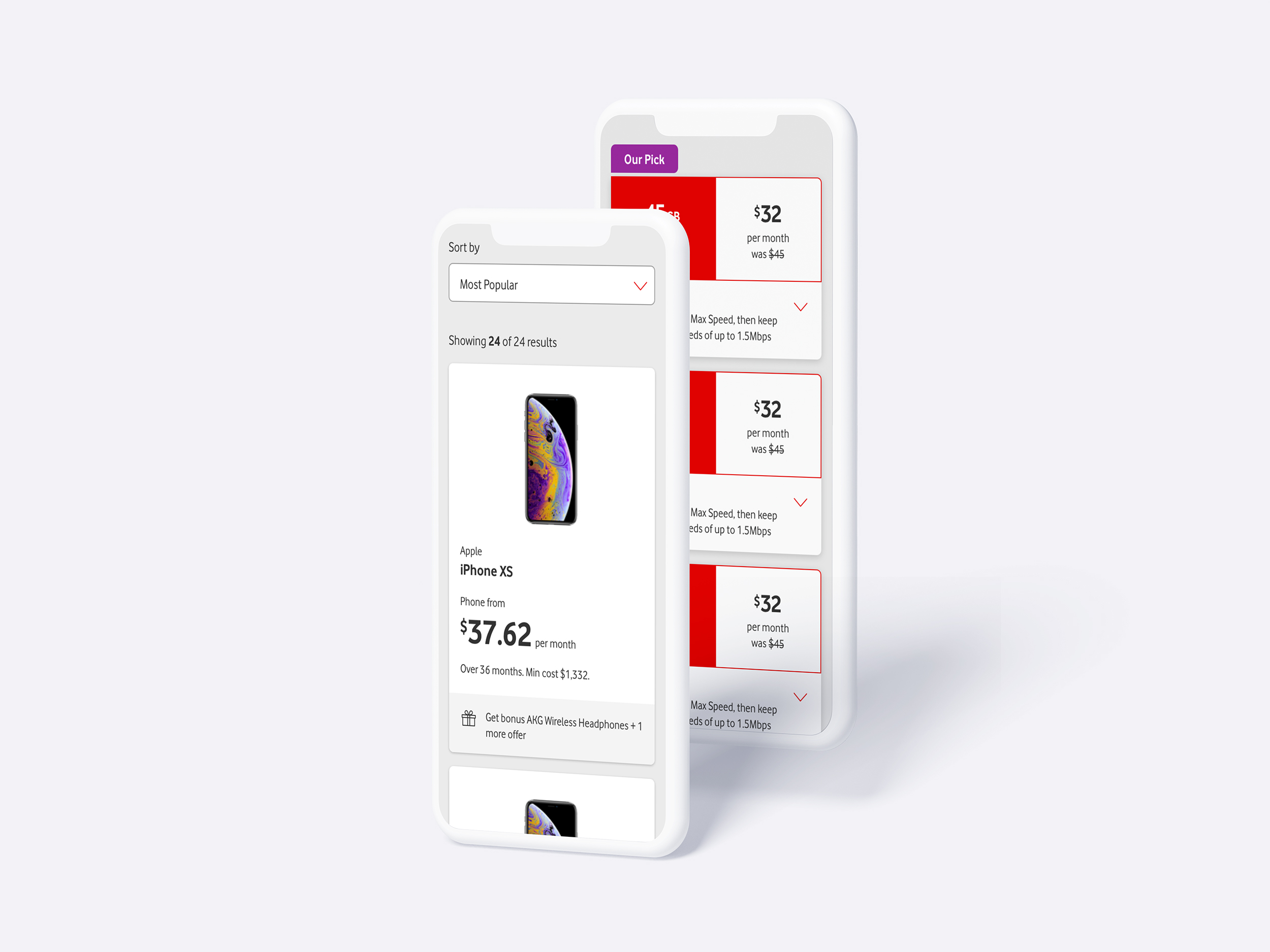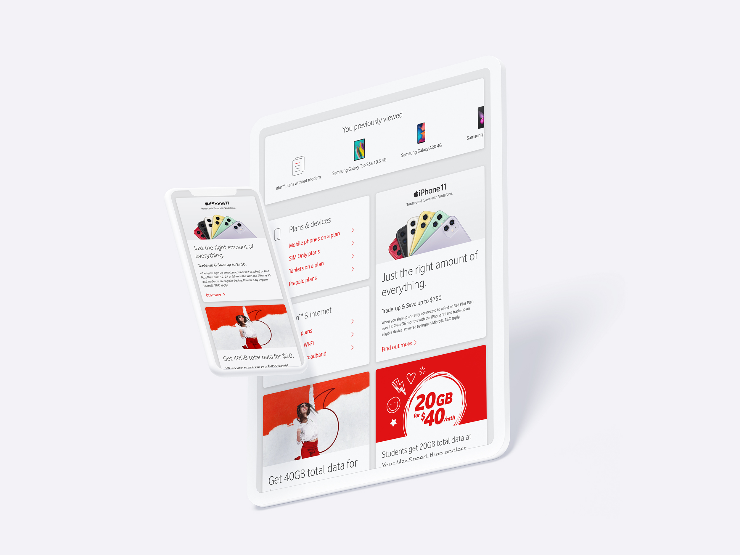 We used the UK design system as our base to construct templates. Where appropriate, we broke the UK design system patterns to create unique AU components, as some had limited functionality or a less ideal interface compared to what we needed to achieve. We had access to a Vodafone image library in addition to the Vodafone Brand Guidelines, and worked hard with their brand team to push the Vodafone brand presence throughout the designs, especially on the home page.
